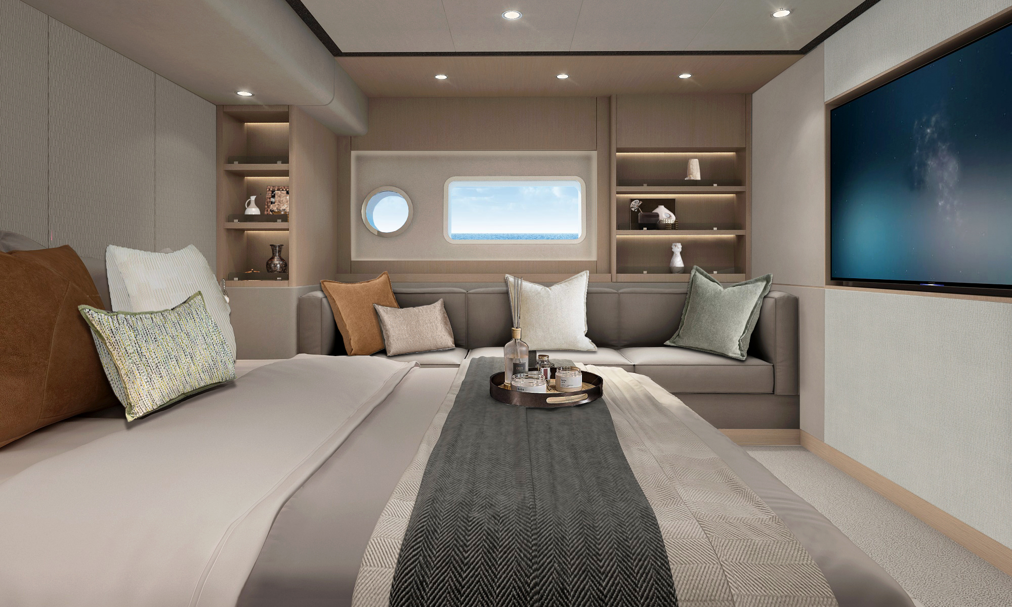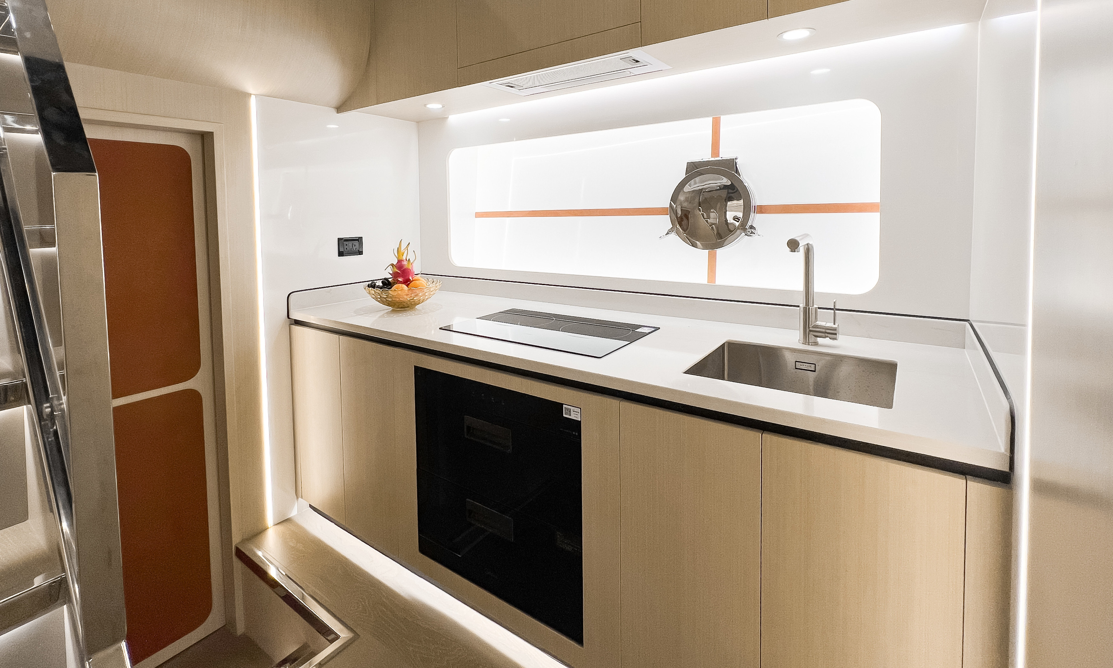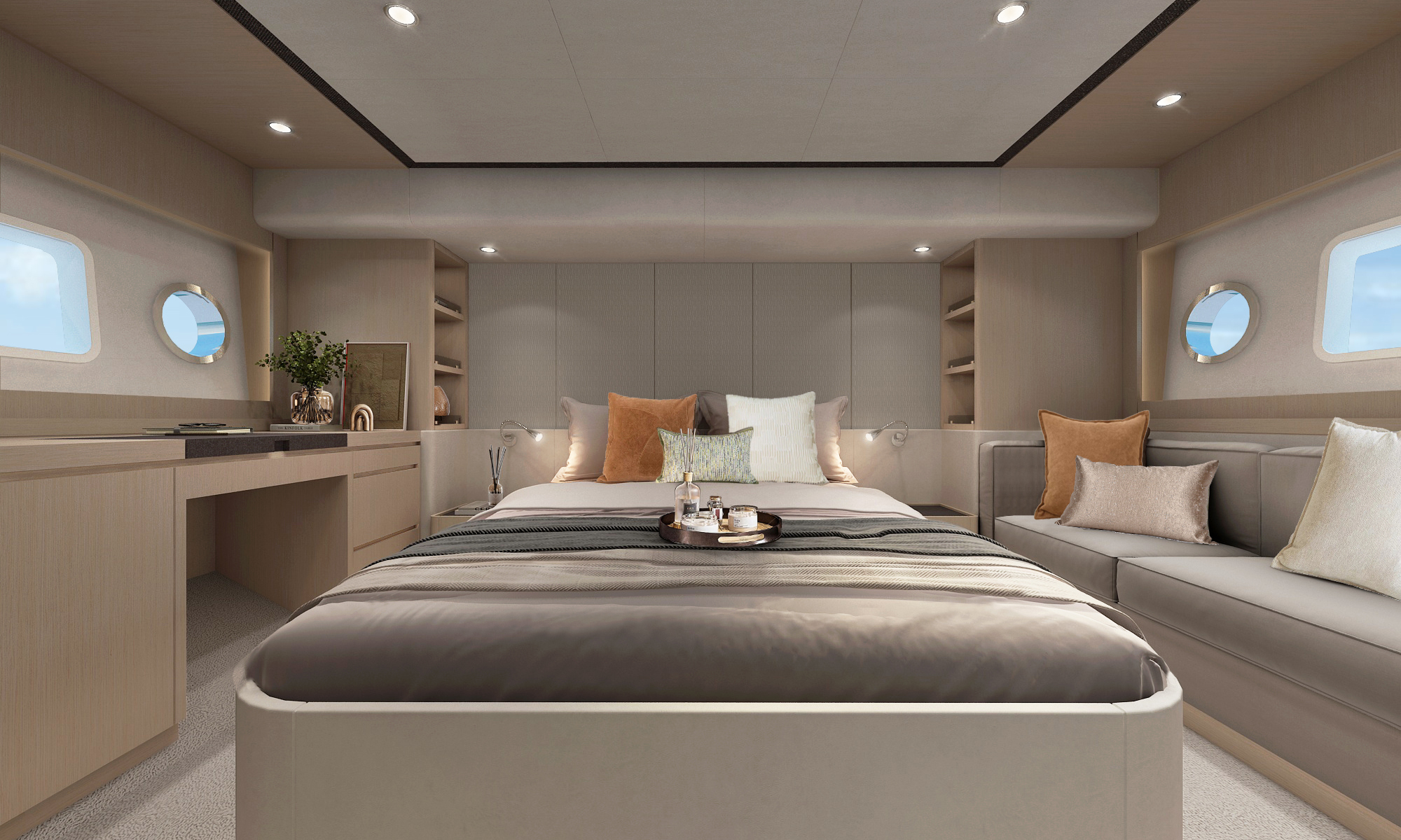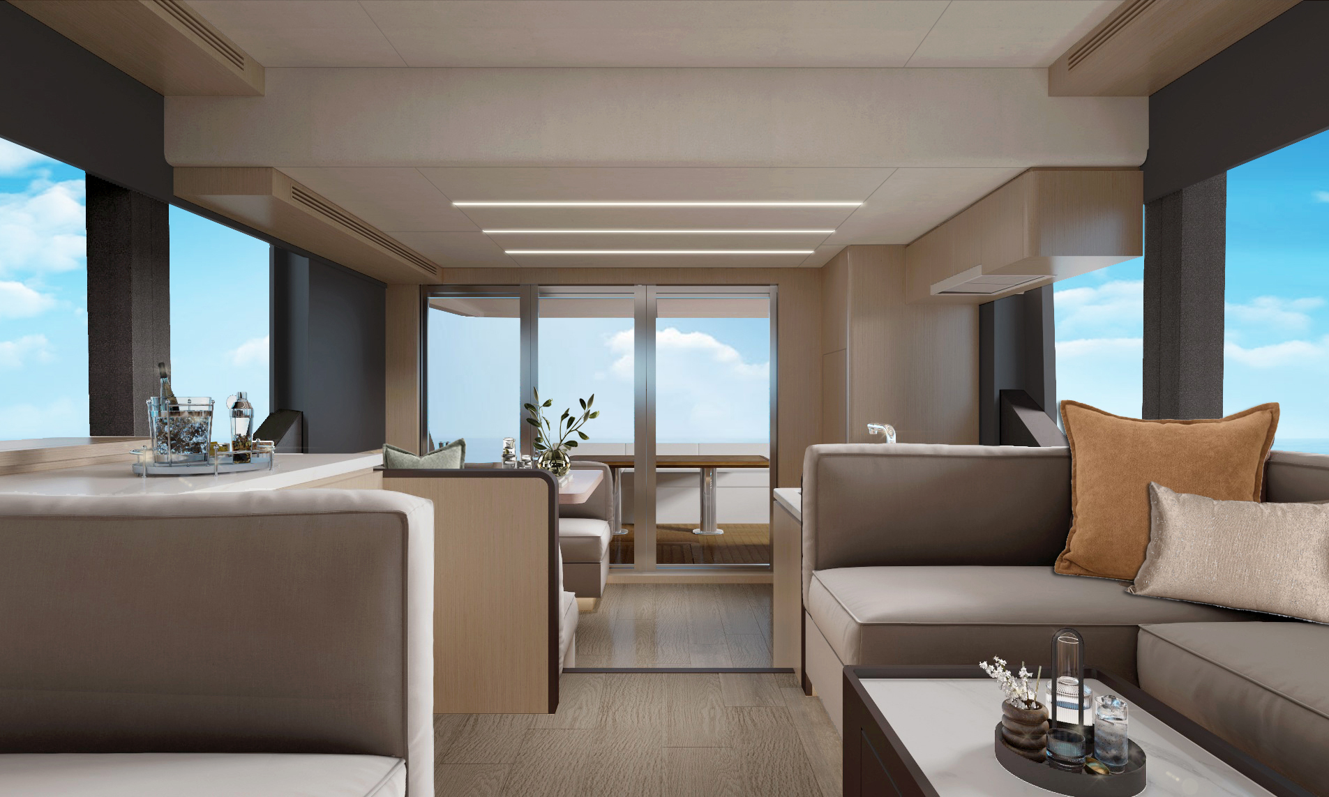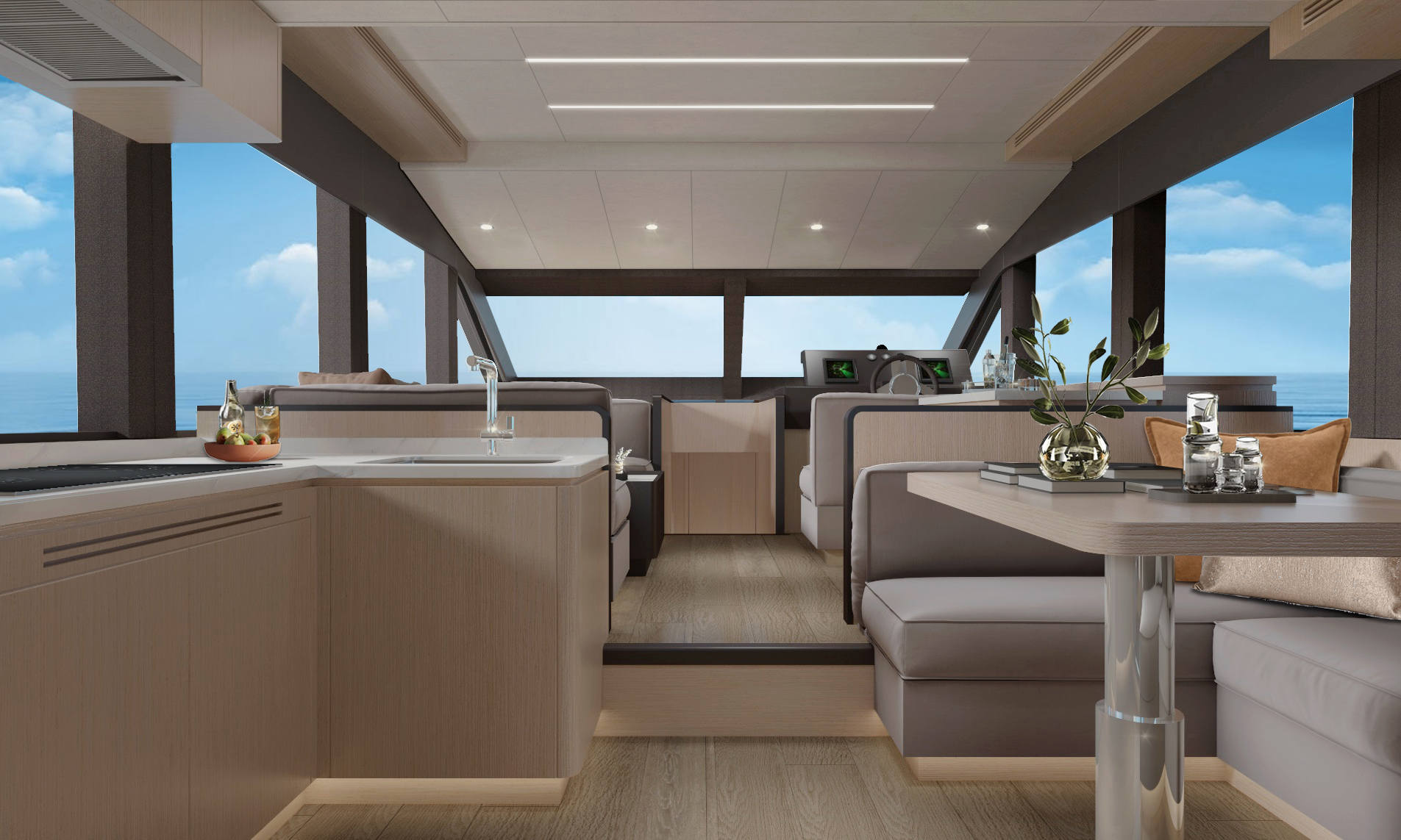 直觀的設計體現了硬朗中帶著柔和的曲線元素,開放式空間和舷窗為內部提供充足光線,讓您坐享廣闊視野的同時,也能擁抱清涼海風。