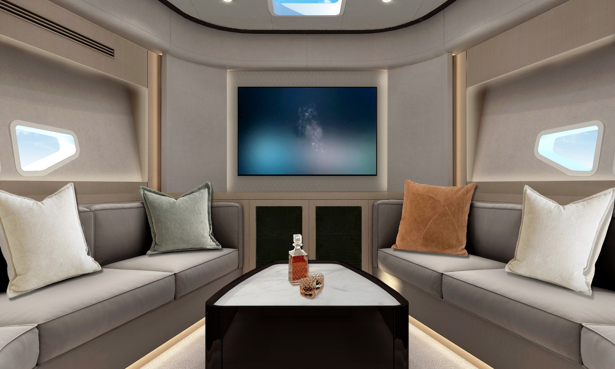 精致的內飾和意想不到的空間解決方案提升了整體的舒適氛圍,實現了室內戶外空間完美互通。室外的柚木地板、室內柔軟耐用的皮革以及防火防水的裝飾材料,量身定製生活質感,為整艘遊艇營造出一種尊貴及溫馨濃鬱的氛圍,多功能娛樂設備縱享船上歡樂時光。
