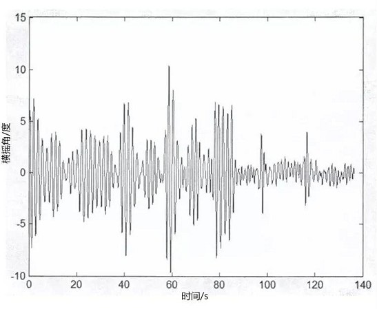 在正橫海浪下該遊艇減搖前後數據對比記錄,下圖中波形前段(0-87)為陀螺減搖裝置不工作時船舶橫搖數據記錄,波形後段(87-136)為陀螺減搖裝置開始工作後船舶橫搖數據記錄。