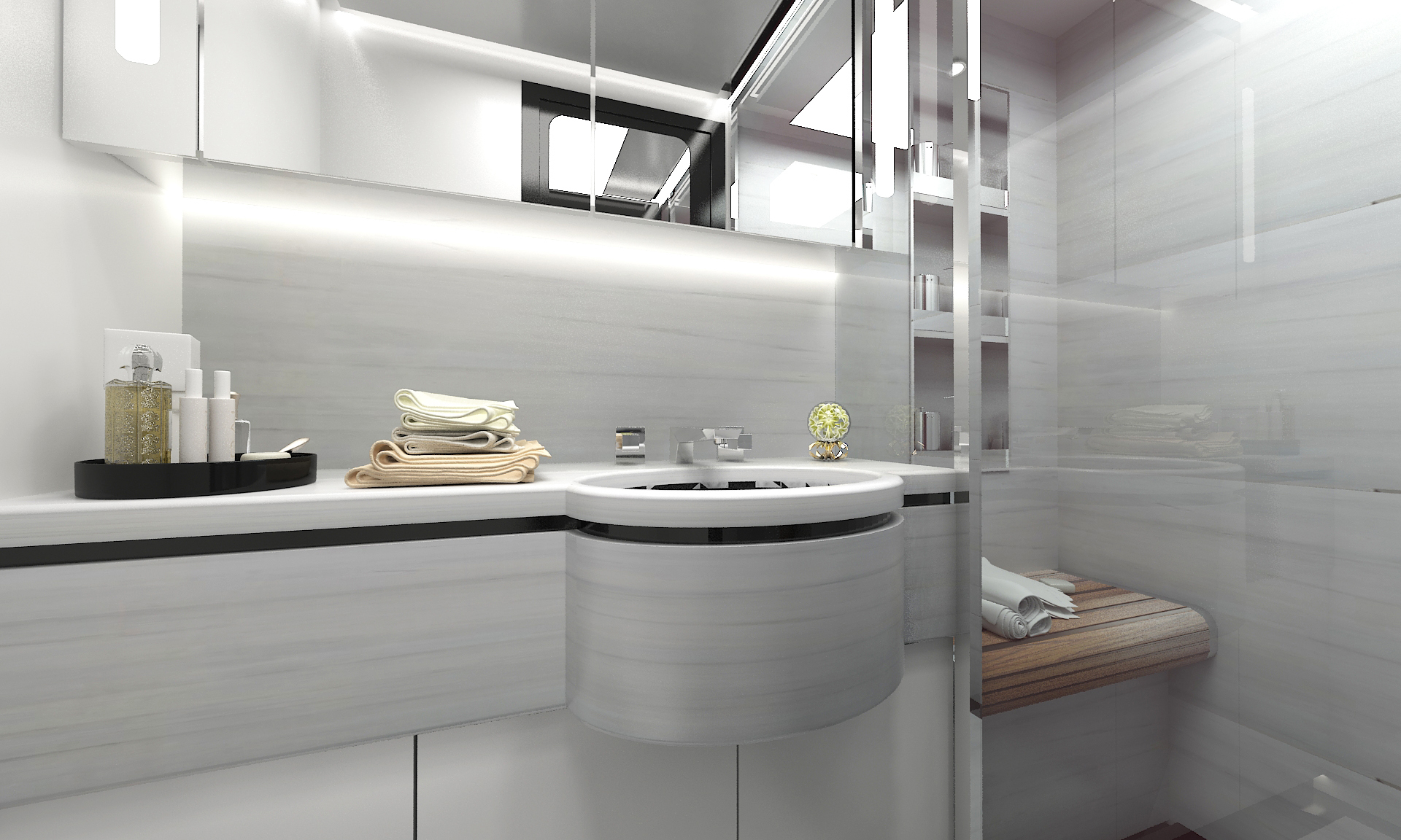 精致的內飾和意想不到的空間解決方案提升了整體的舒適氛圍,實現了室內戶外空間完美互通。室外的柚木地板、室內柔軟耐用的皮革以及防火防水的裝飾材料,量身定製生活質感,為整艘遊艇營造出一種尊貴及溫馨濃鬱的氛圍,多功能娛樂設備縱享船上歡樂時光。