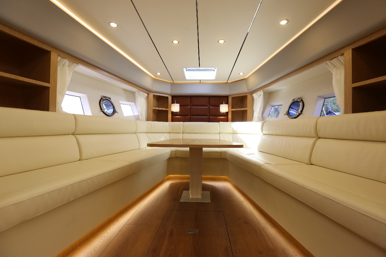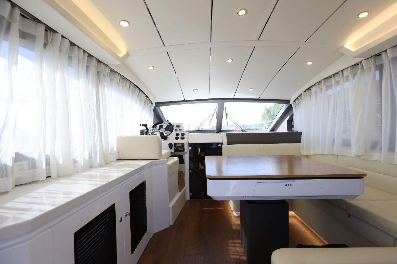駕駛艙特色休閑功能,也是目前在同尺寸範圍唯一,在駕駛艙帶麻將桌的動力艇。